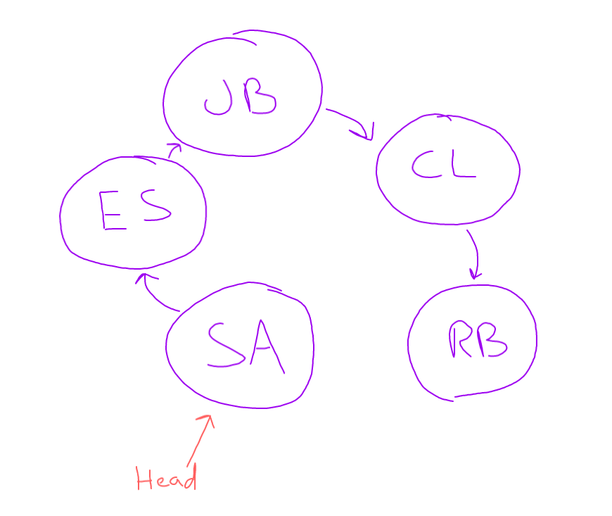 Anyone who moves off the end of the linked list, should then move to the head