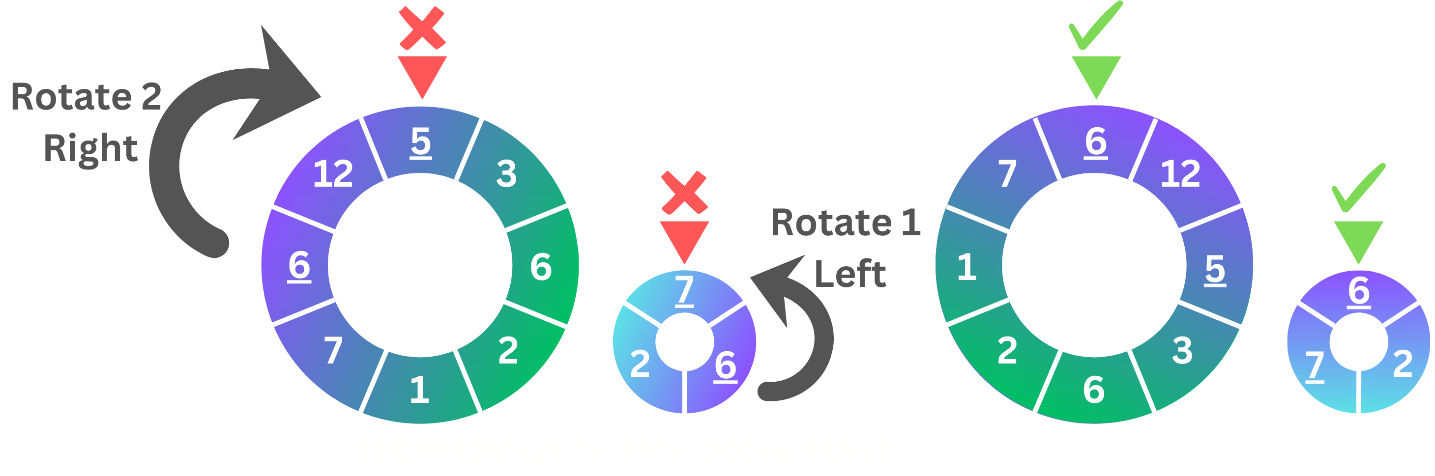 When entering the input for the dial, it starts at the top number and moves around the disk clockwise (moving to the right). For example if the input for the first dial was 5 3 6 2 1 7 6 12 and the second dial was 7 6 2 here is an example of how these disks would look like and how to solve them: