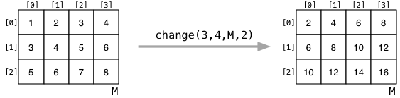 /** * C function to multiply a matrix by a scalar. * * nrows: Number of rows in the matrix * ncols: Number of columns in the matrix * M: Matrix M * factor: Scalar factor to multiply by */ void change (int nrows, int ncols, int M[nrows][ncols], int factor) { for (int row = 0; row < nrows; row++) { for (int col = 0; col < ncols; col++) { M[row][col] = factor * M[row][col]; } } }