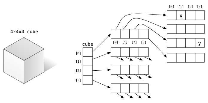 The cube could be implemented as an array of pointers, each of which points to a slice of the cube. Each slice of the cube is also an array of pointers, and each of those points to an array of