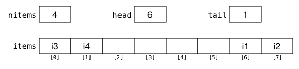 struct _queue { int nitems; // # items currently in queue int head; // index of oldest item added int tail; // index of most recent item added int maxitems; // size of array Item *items; // malloc'd array of Items };