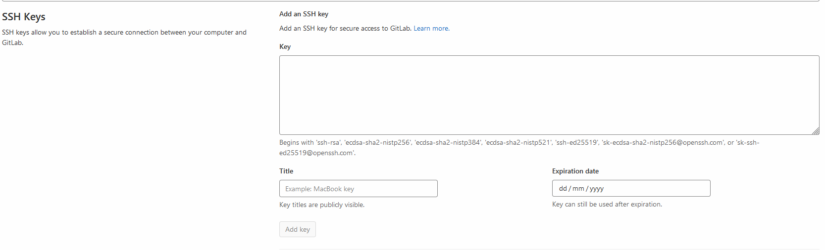 Once logged in, you will need to link an SSH key to your account, in order to have permission to pull / push code in Gitlab.