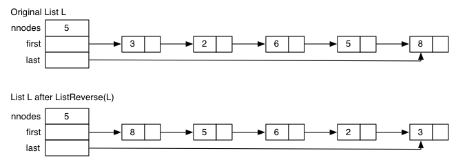The ListReverse() function in the ADT provides the functionality to revrese lists. The following diagram shows how it works on a sample List: