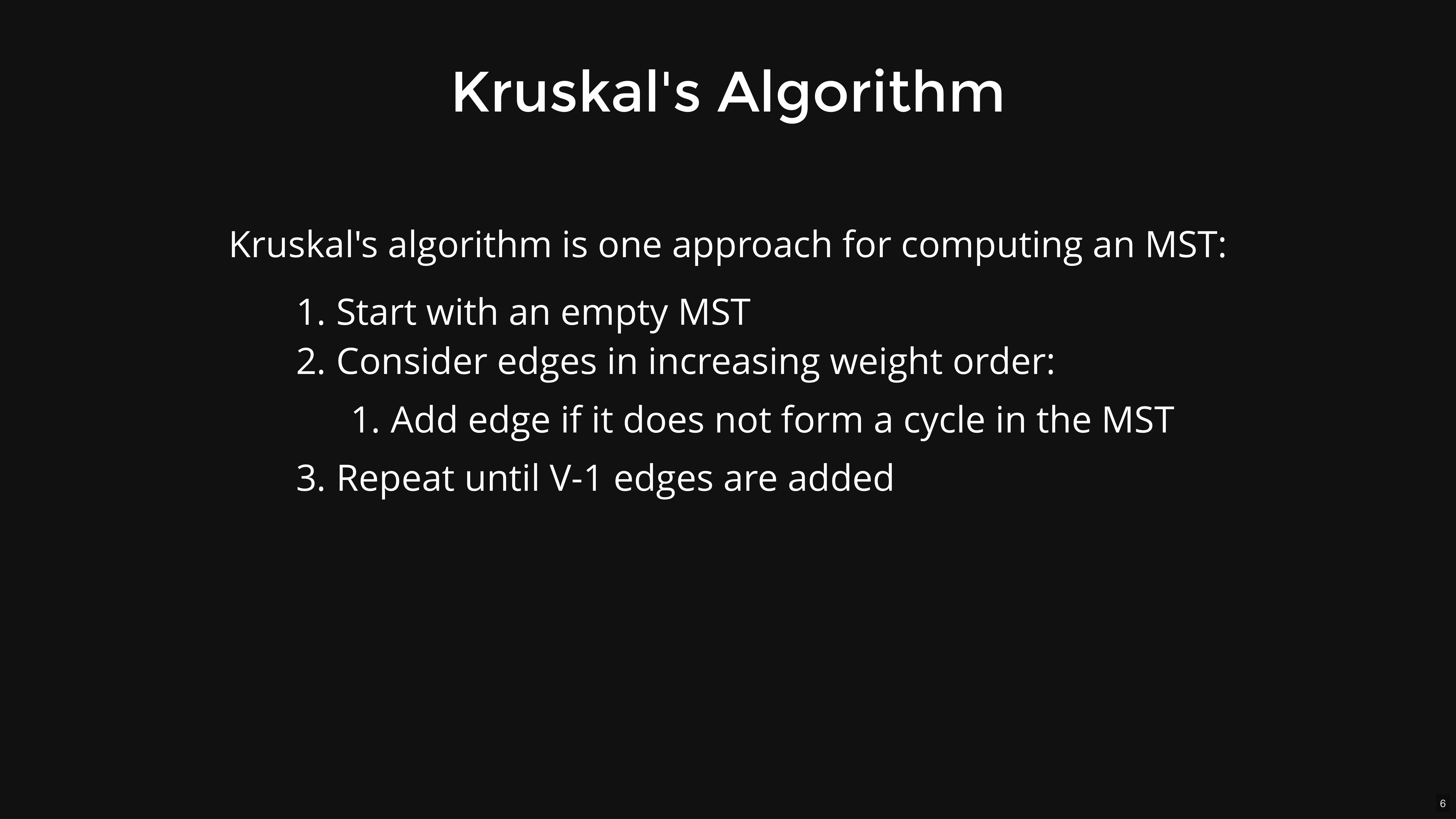 Creating MST involves gathering the lowest valued edges while eliminating edges that create loops/cycles. Can be unreliable as it may return a disconnected graph (not all nodes are reachable from some given node). It can be checked if this has been completed by a DFS across all nodes to see if every node is accessible, however, this is generally time costly. Prim's algorithm is a good alternative in this case as it only assesses edges to be added to MST if one of its nodes has already been visited.