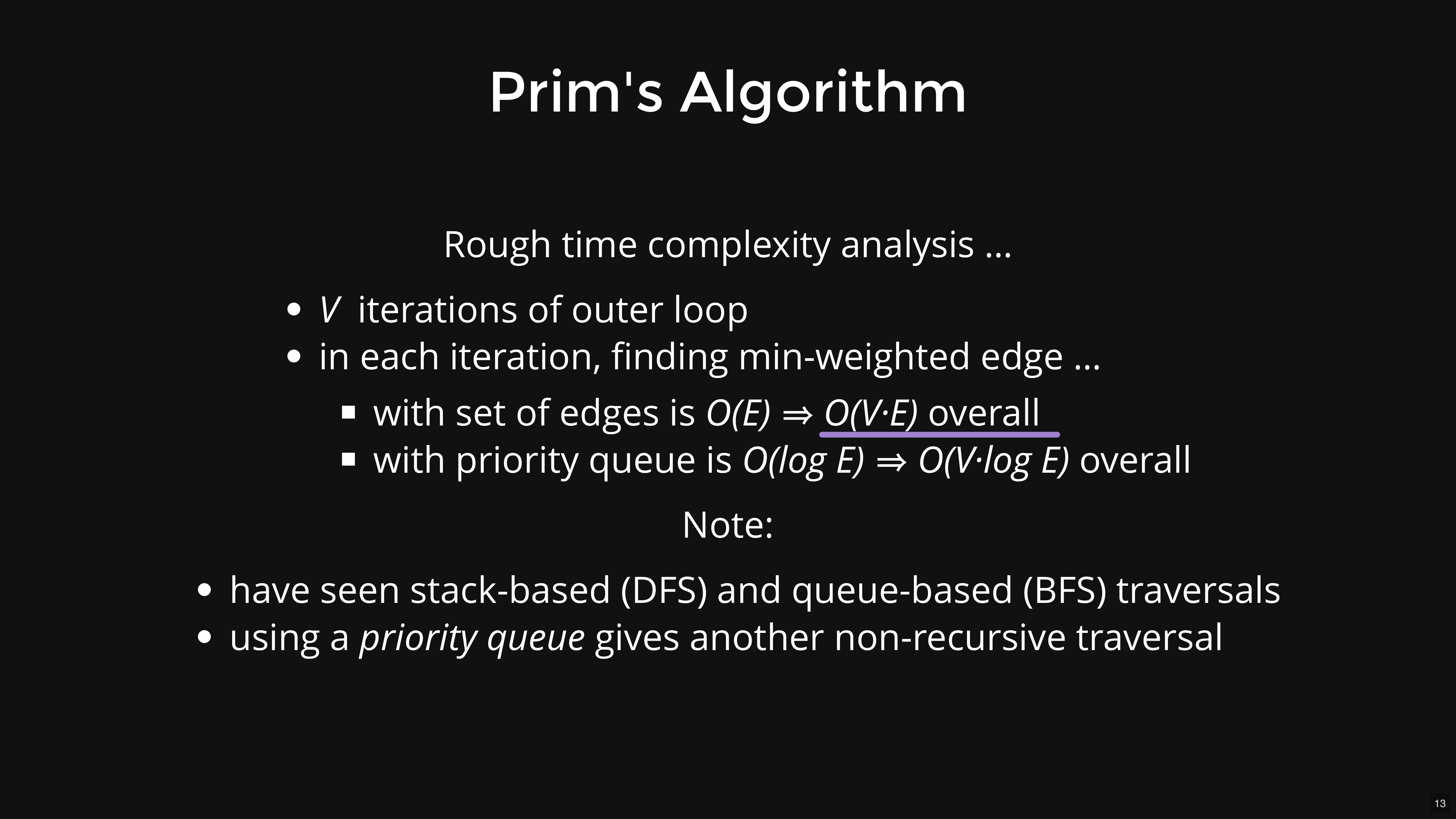 | Prim’s algorithm runs faster in dense graphs. | Kruskal’s algorithm runs faster in sparse graphs. | ||