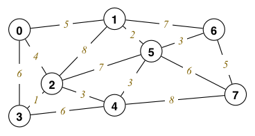This algorithm effectively constructs the MST by gradually joining together the connected graphs in a forest that starts with each subgraph being a single node. On each iteration, it add a new edge to the forest, and reduces the number of subgraphs by one. Show how it would construct the MST for the graph below: