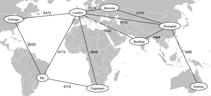 Geographic data is widely available, thanks to sites such as GeoNames. For this lab, we have downloaded data files from the City Distance Dataset by John Burkardt from the Department of Scientific Computing at Florida State University. The dataset that we will use contains information about distances between 30 prominent cities/locations around the world. These are great-circle distances; we'll assume that these are the distances that an aircraft would fly between two cities. The data that we have forms a complete graph in that there is a distance recorded for every pair of cities.