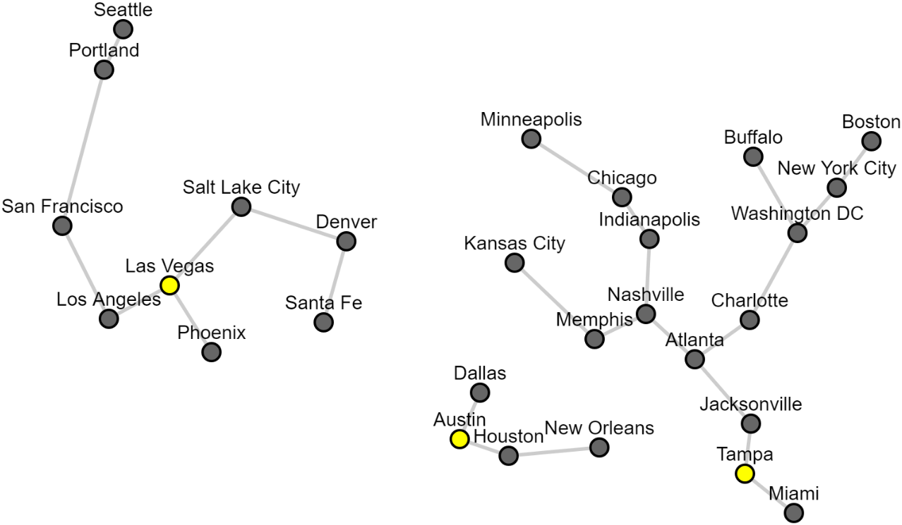 gridPlanner.creads in a series of places from standard input (one per line), callsplanGrid1orplanGrid2, which determine where to build power lines to minimise cost, and then displays the result. LiketestGraphMst.c, this program also has two output modes: plain text and visualiser.Every place is either a city or a power plant. Places are represented by four comma-separated values: (1) a string which is either "city" or "plant", (2) the name of the place, (3) its x-coordinate, and (4) its y-coordinate. See the input files in the