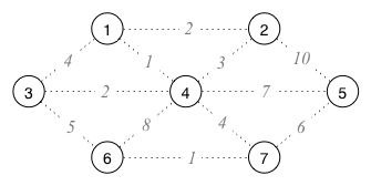 vSet = { 1, 2, 3, 4, 5, 6, 7 } dist = [ 0, 5, 4, 6, ∞, ∞, ∞, ∞ ] pred = [ -1, 0, 0, 0, -1, -1, -1, -1 ]Now the vertex in vSet with minimum dist[] is 2. Considering all edges from 2 to nodes still in vSet: