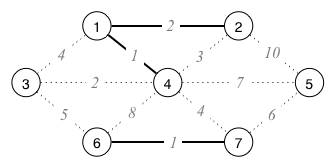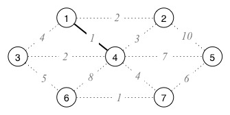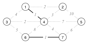 forloop. We do not show the intermediate state of the graph when have added an edge which turns out to produce a cycle.In the first iteration, we could choose either 1-4 or 6-7, since both edges have weight 1. Assume we choose 1-4. Since its inclusion produces no cycles, we add it to the MST:
