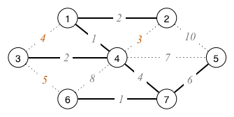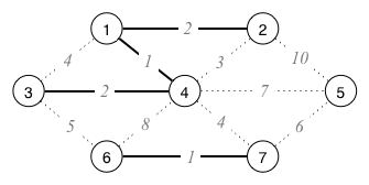 In the next iteration, we would first consider the lowest-cost unused edge. This is 2-4, but its inclusion would produce a cycle, so we ignore it. We then consider 1-3 and 4-7 which both have weight 4. If we choose 1-3, that produces a cycle so we ignore that edge. If we add 4-7 to the MST, there is no cycle and so we include it: