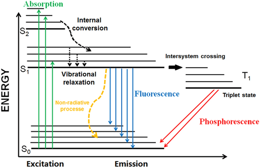 fluorescence involves exciting an electron to a higher energy state, then relaxing to the lowest excited electronic