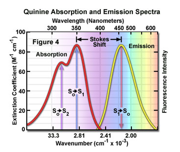 Quinine absorbs in the ultraviolet region and emits in the blue/green region of the visible section. The stokes shift is the distance between